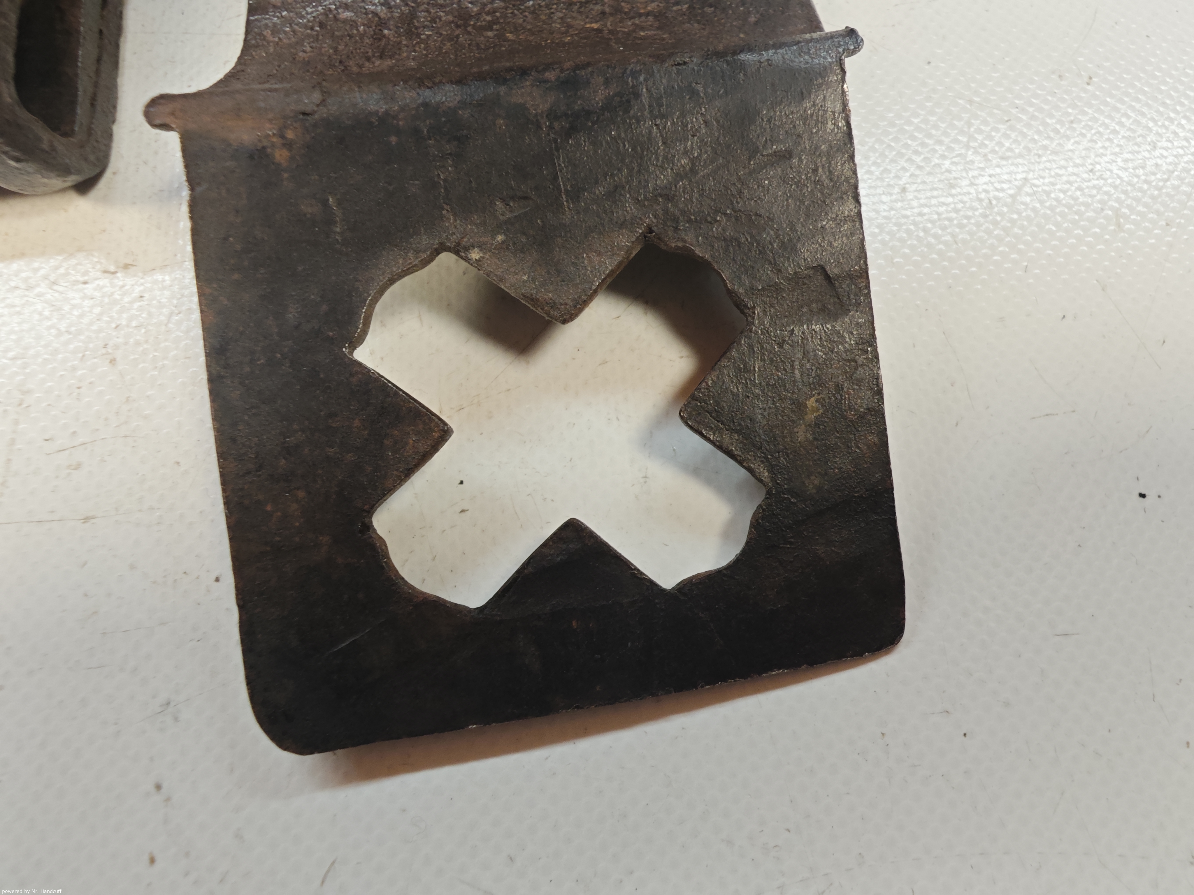 Mittelalterliche Handfessel einzeln mit Tuelle gestanztes Kreuz