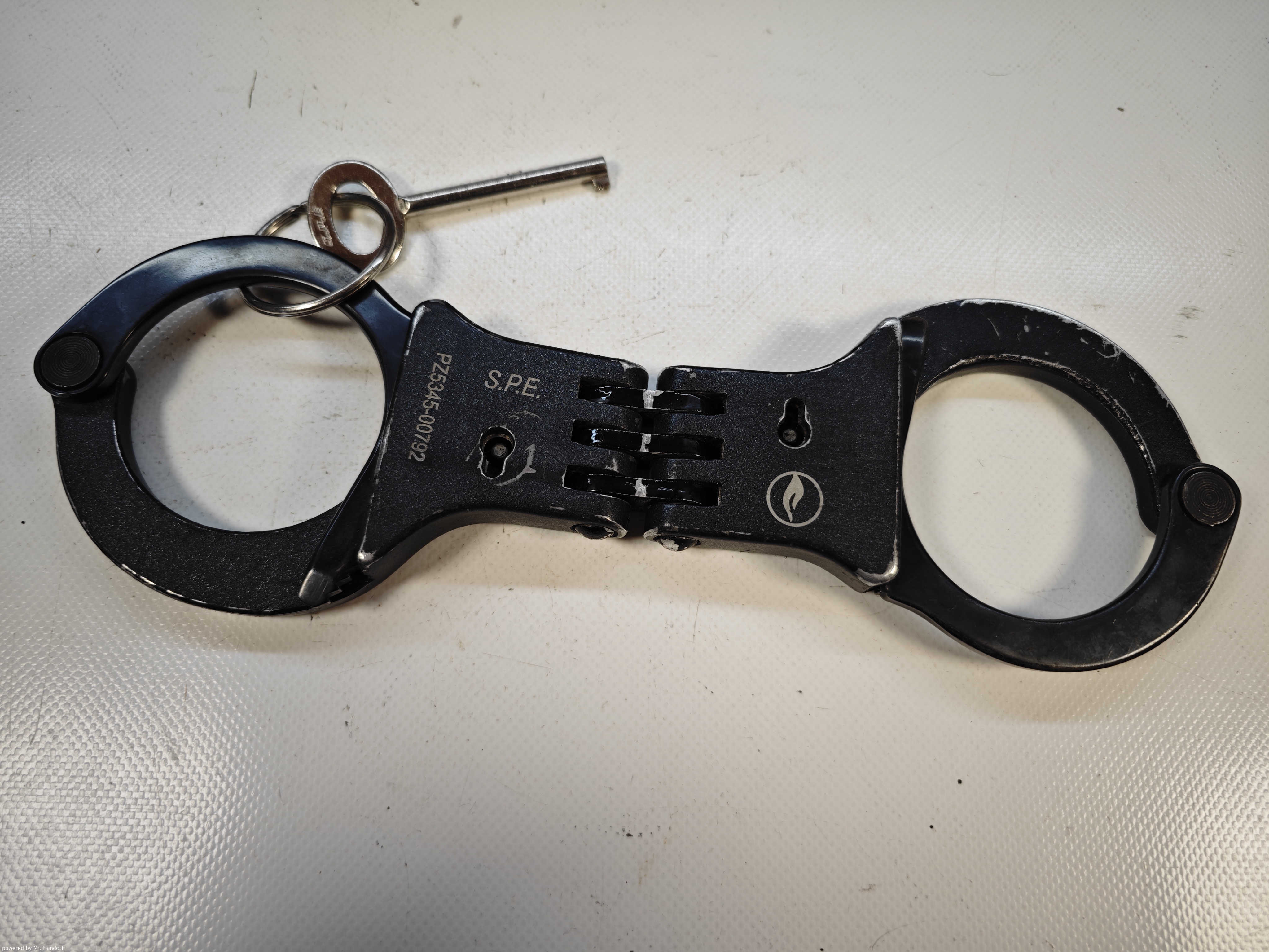 S.P.E. Handschellen schwarz mit Polizeilogo und Silber Roller am Double Lock